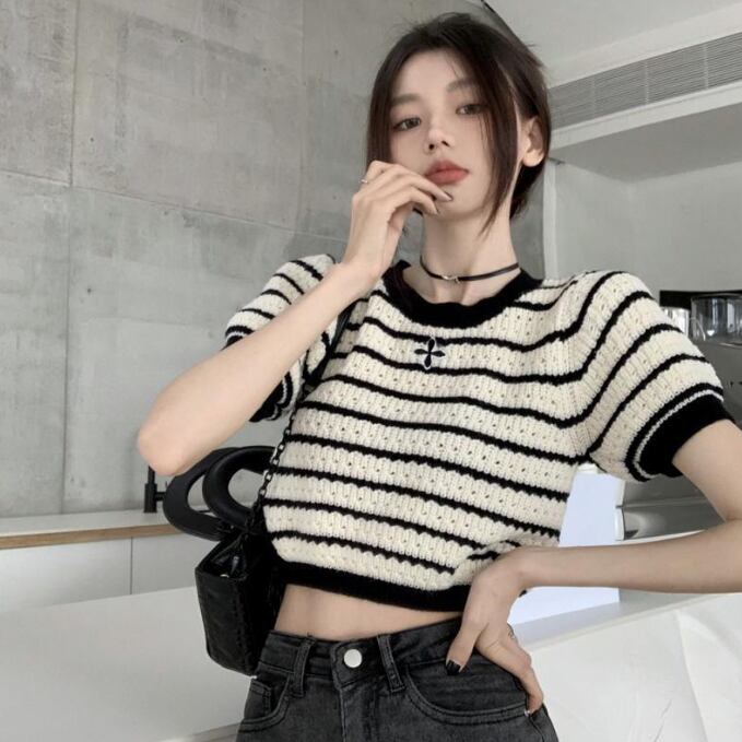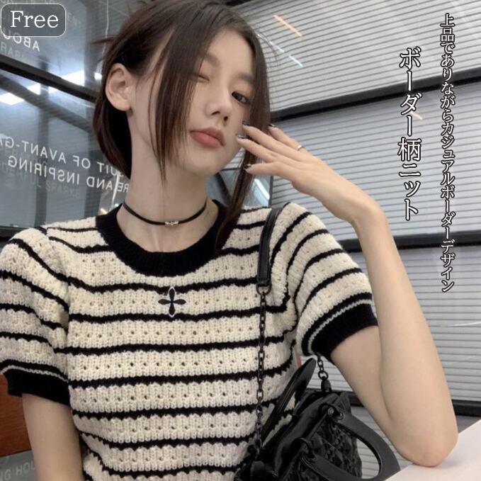 レディース ラウンドネック ボーダ柄 ショート丈 着痩せ 可愛い 半袖ニット