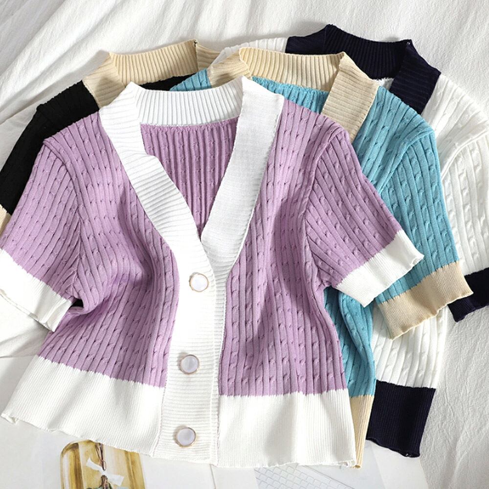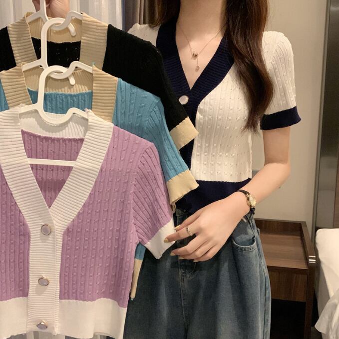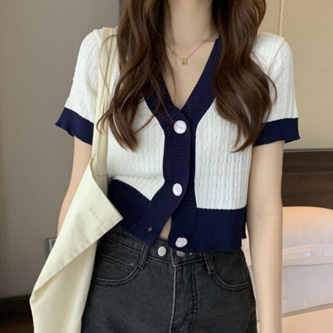 レディース 半袖ニット カーディガン Vネックボタン ショート丈 大人 可愛い