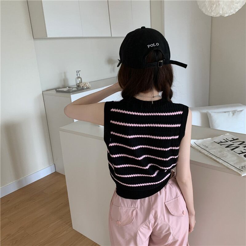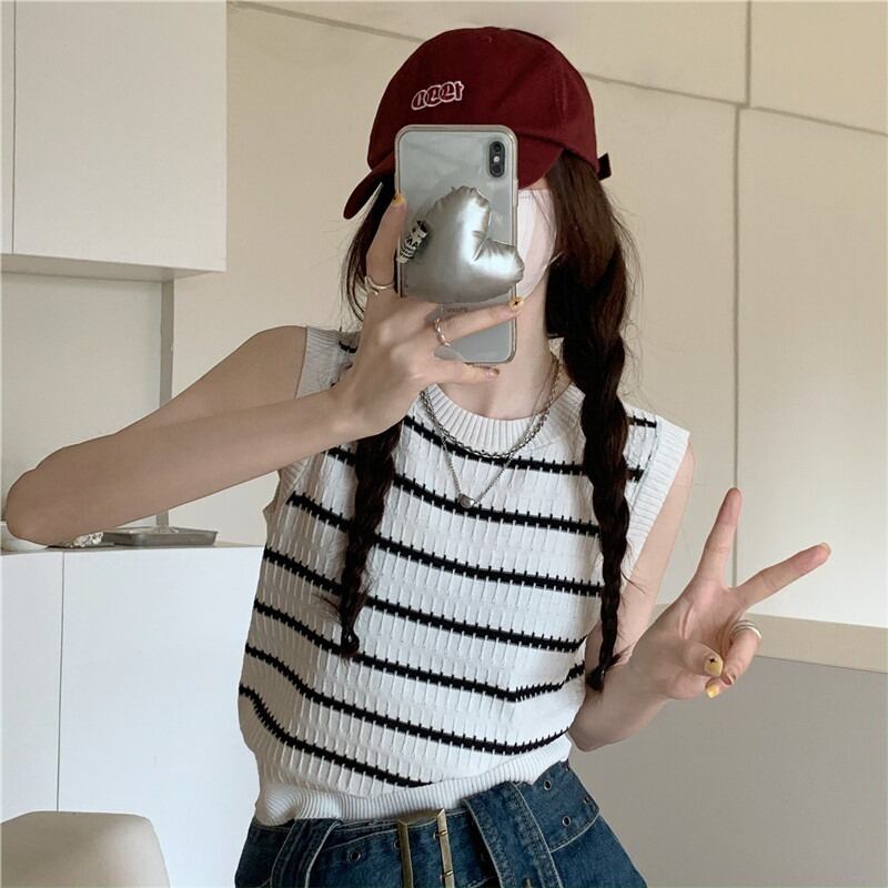 ボーダー柄 ノースリーブ ニット トップス ソー セーター ショート ショート丈 袖なし