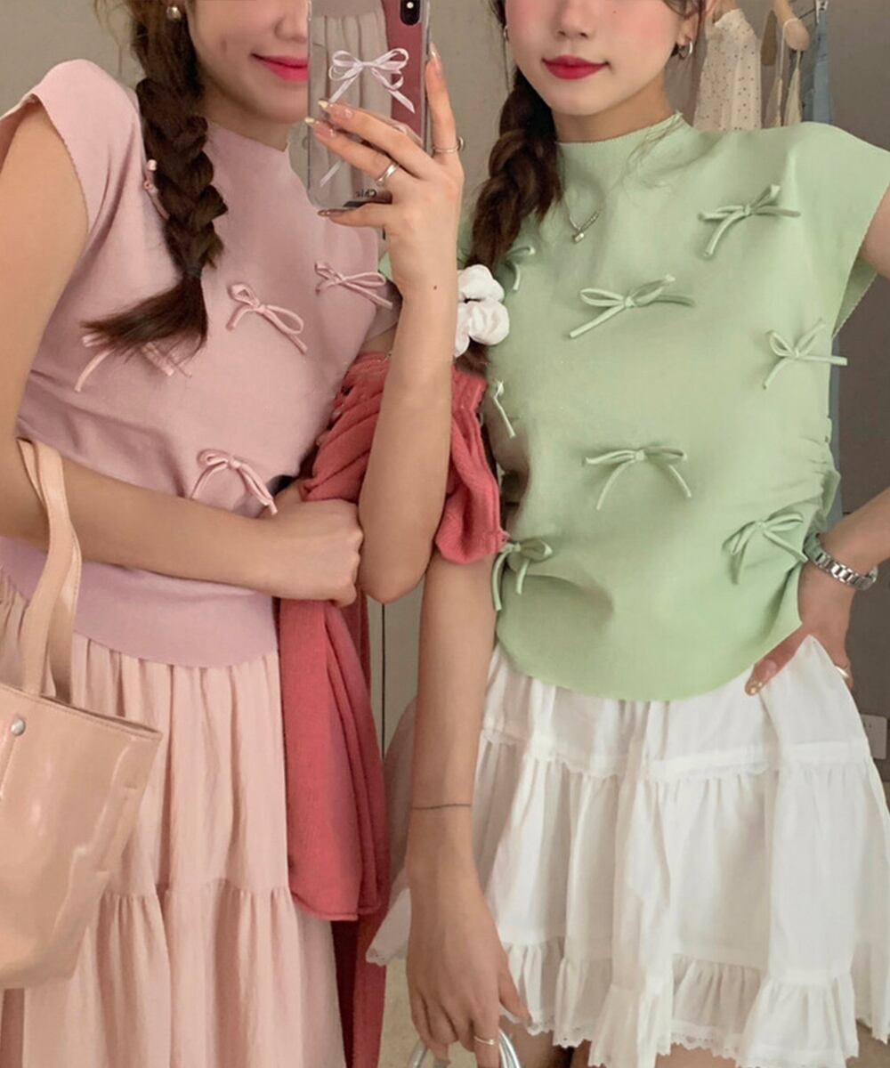 リボンモチーフが可愛いショート丈のニットトップス。