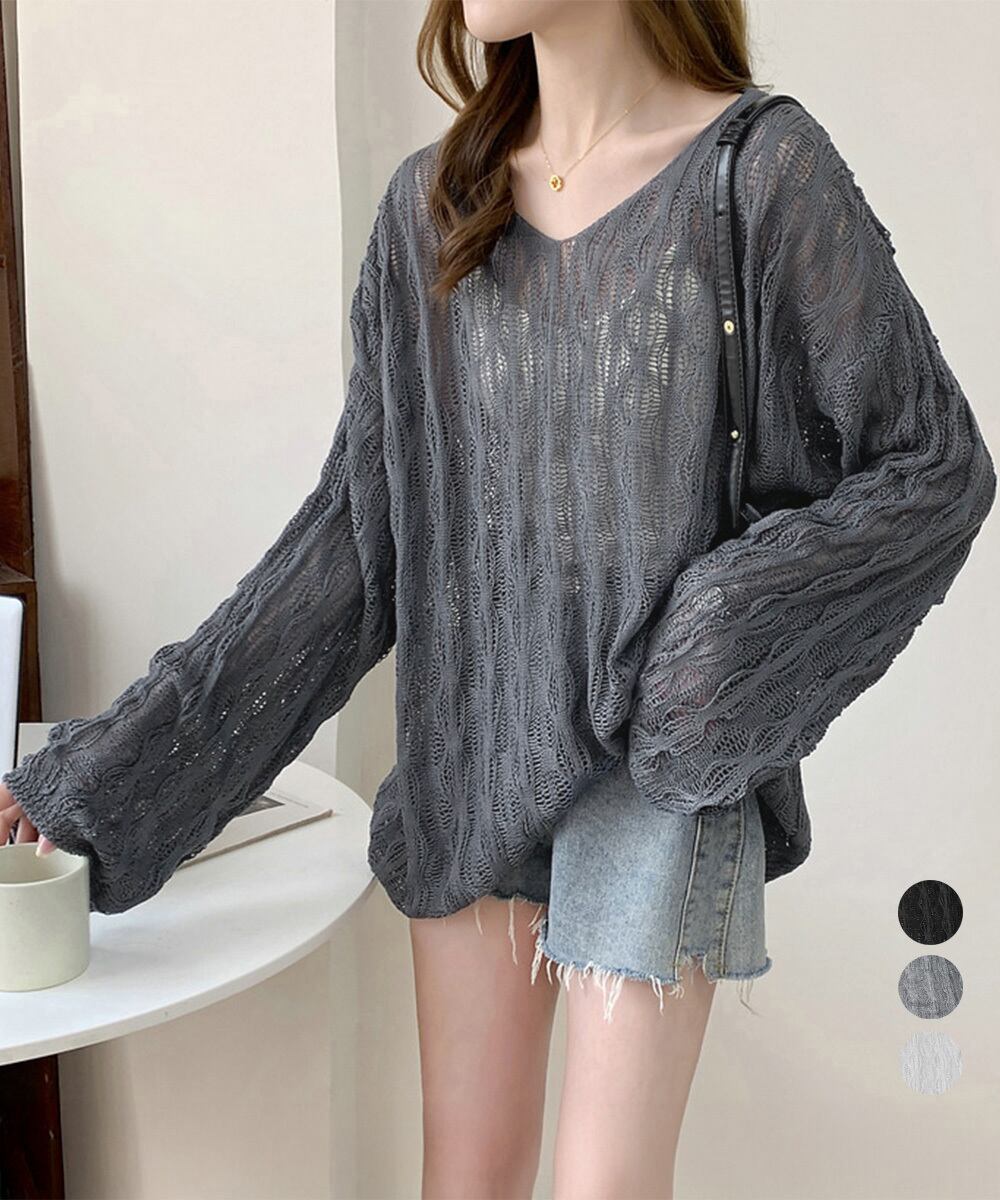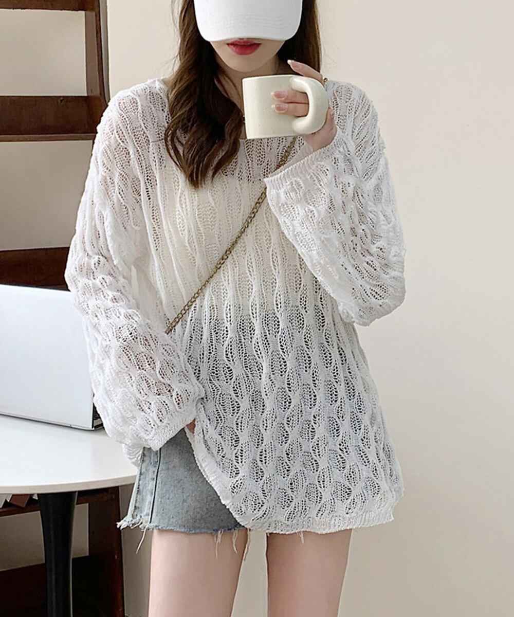 ざっくりとした透かし編みデザインが魅力的な可愛いメッシュニットトップス