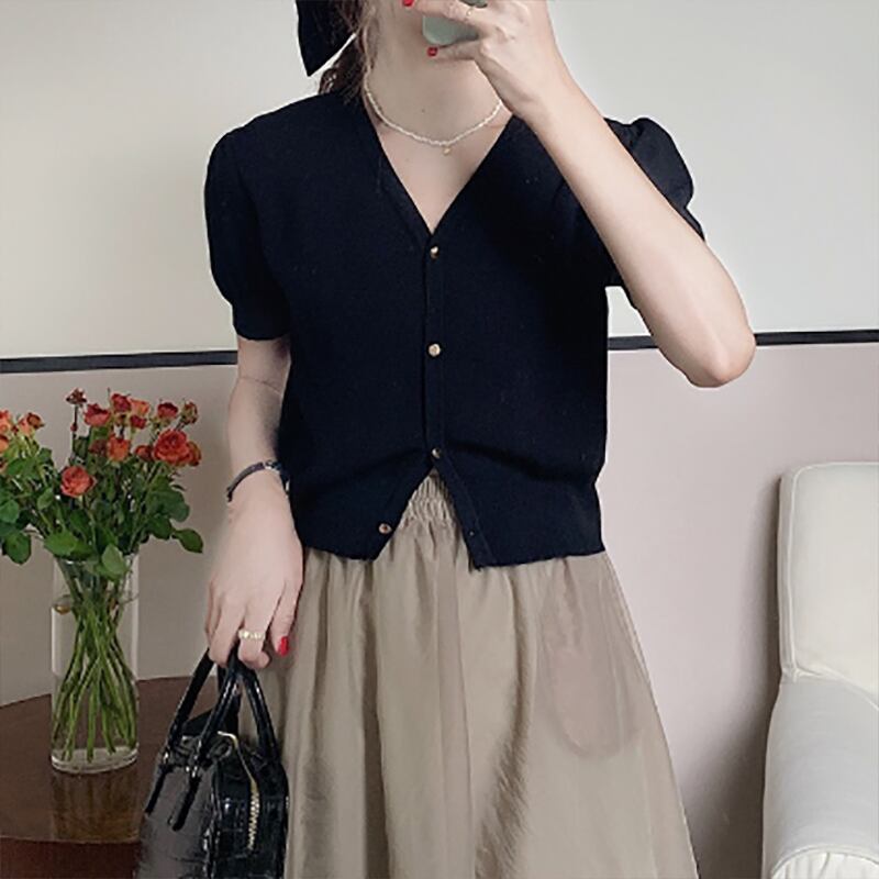 レディース 半袖ニット カーディガン Vネックボタン ショート丈 大人 可愛い