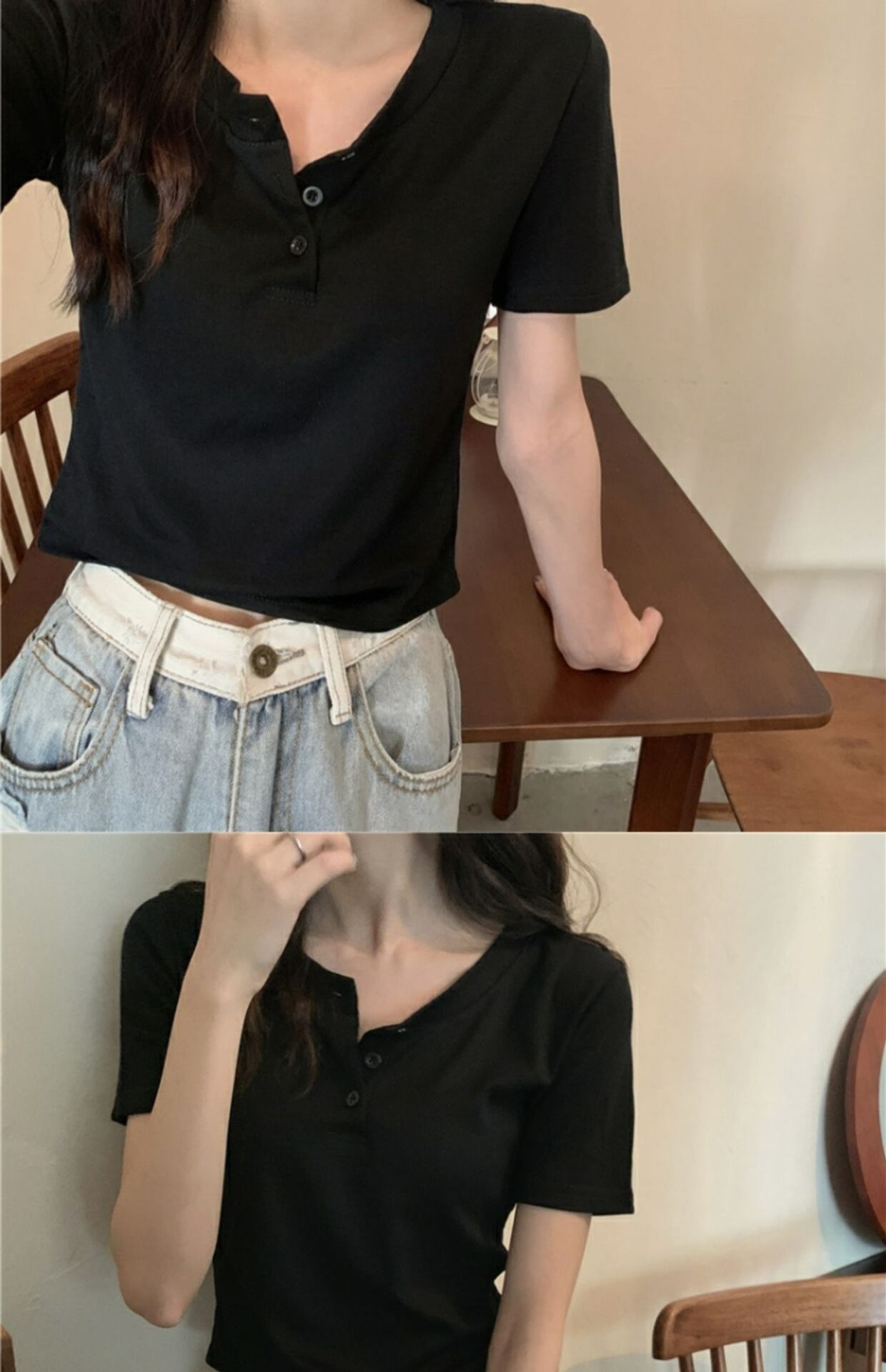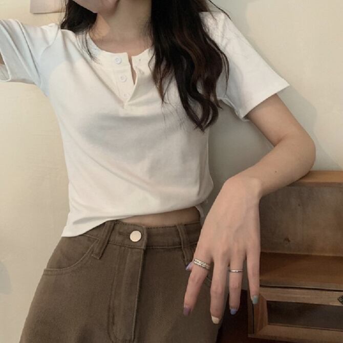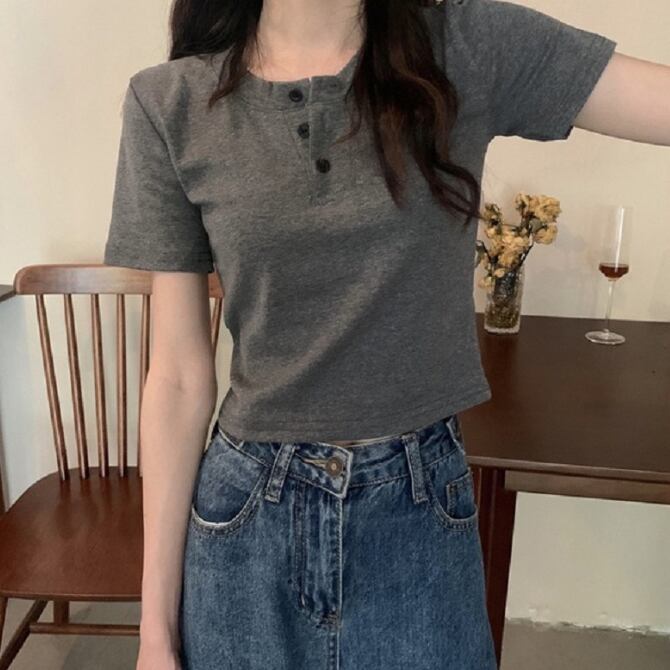 レディース ボタン ショート丈 半袖 トップス オフィス カジュアル クロップド