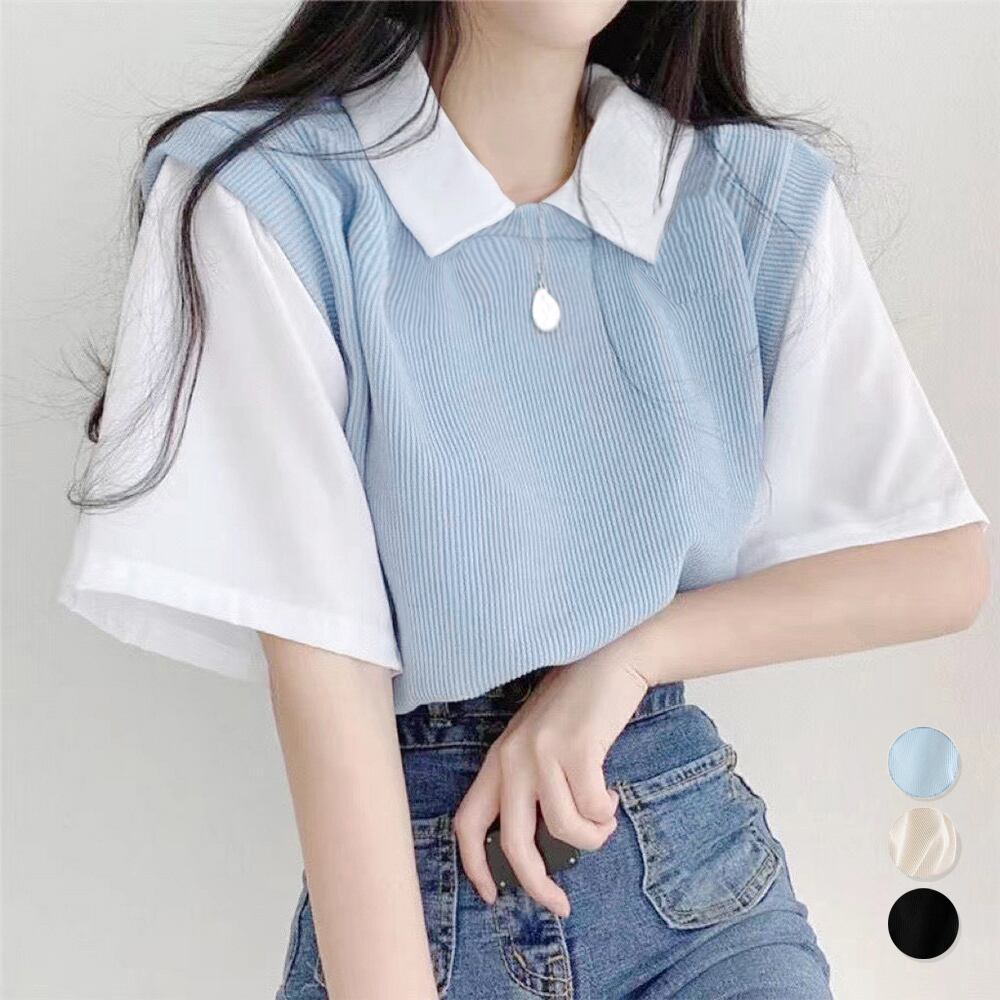 レディース 襟付きトップス バイカラーカットソー 切り替えtシャツ 韓国プルオーバー大人カジュアル 体型カバー 夏服配色
