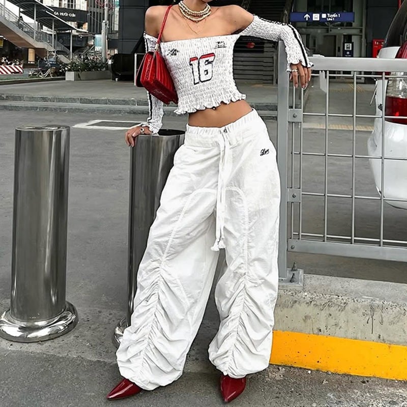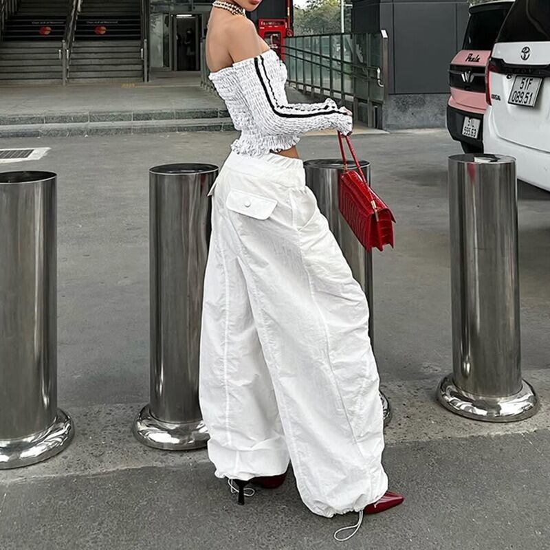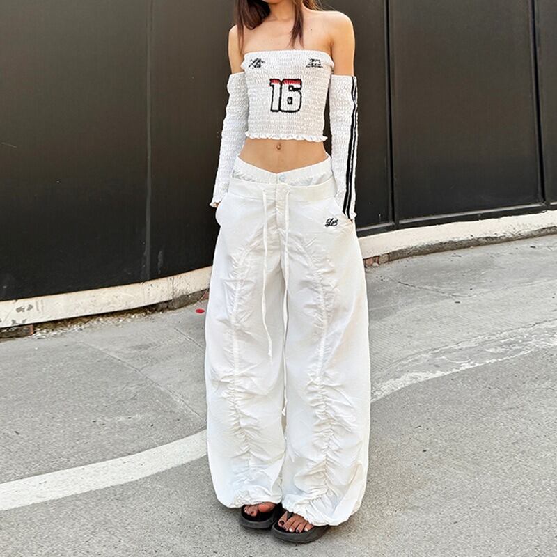 アメリカンストリート風 クールガール向けプリーツ ドローストリング入り ホワイト織地パンツ