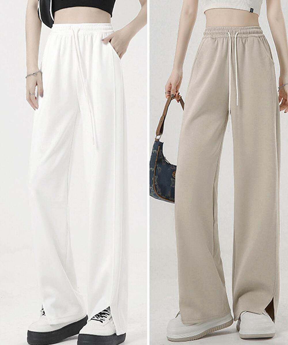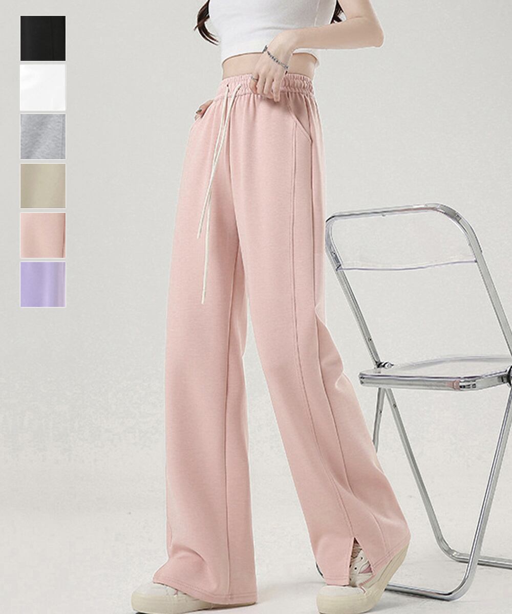 サイドスリットワイドパンツ ゆったり ワイドイージーパンツ ドローストリング ウエストゴム ジョガーパンツ ポケット付