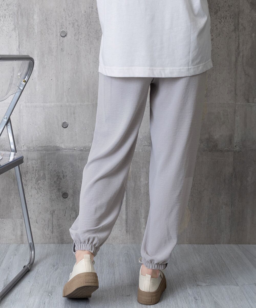 ウエストは総ゴム仕様で、ストレスフリーなはき心地が魅力のイージーパンツ