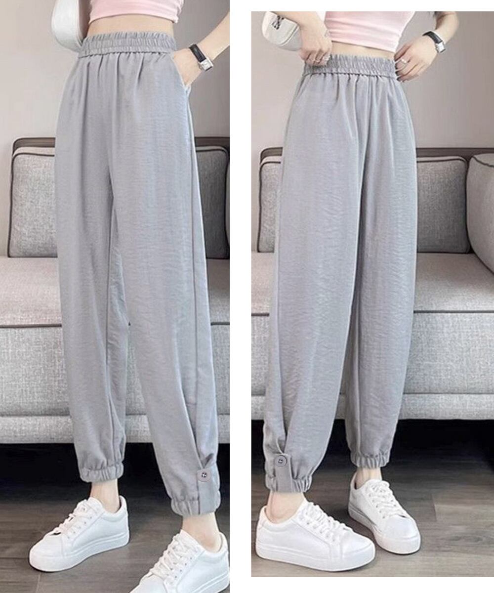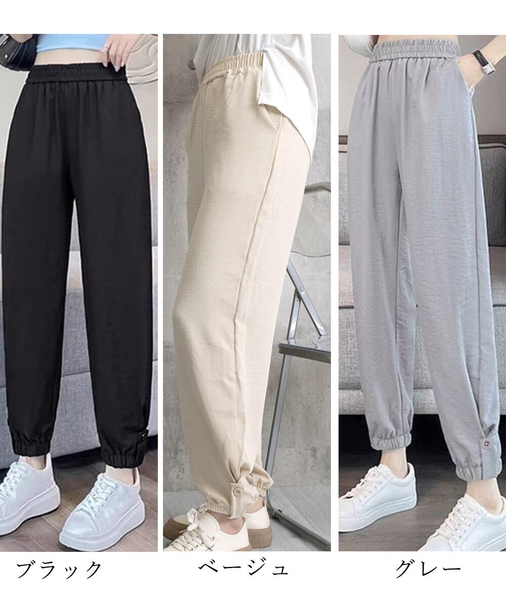イージーパンツ 韓国風 無地 レディースボトムス 九分丈 ゆったり 薄手 ポケット付き 着回し 裾ゴムパンツ カジュアル