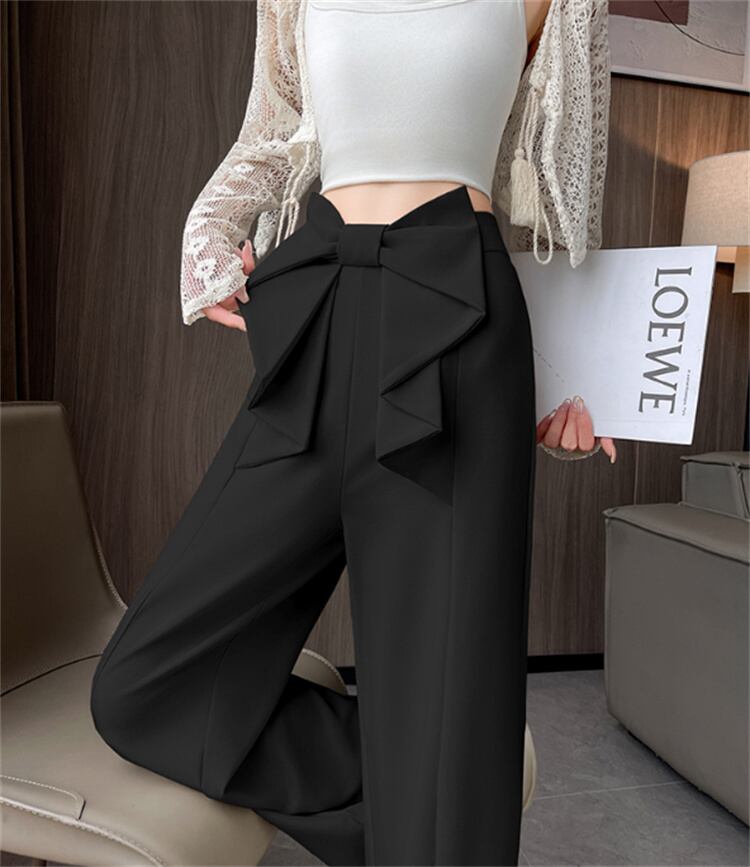 夏のオフィスパンツ ひも飾り ストレート脚ライン ゆったり丈(ハイウエスト)