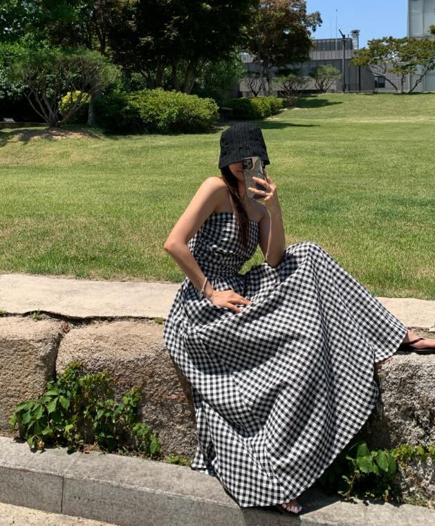 女 レディース 袖なし チェック柄 ロング ワンピース 台型スカート