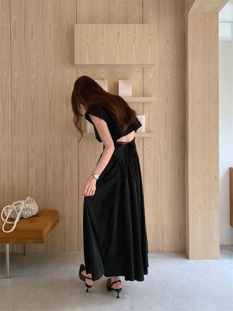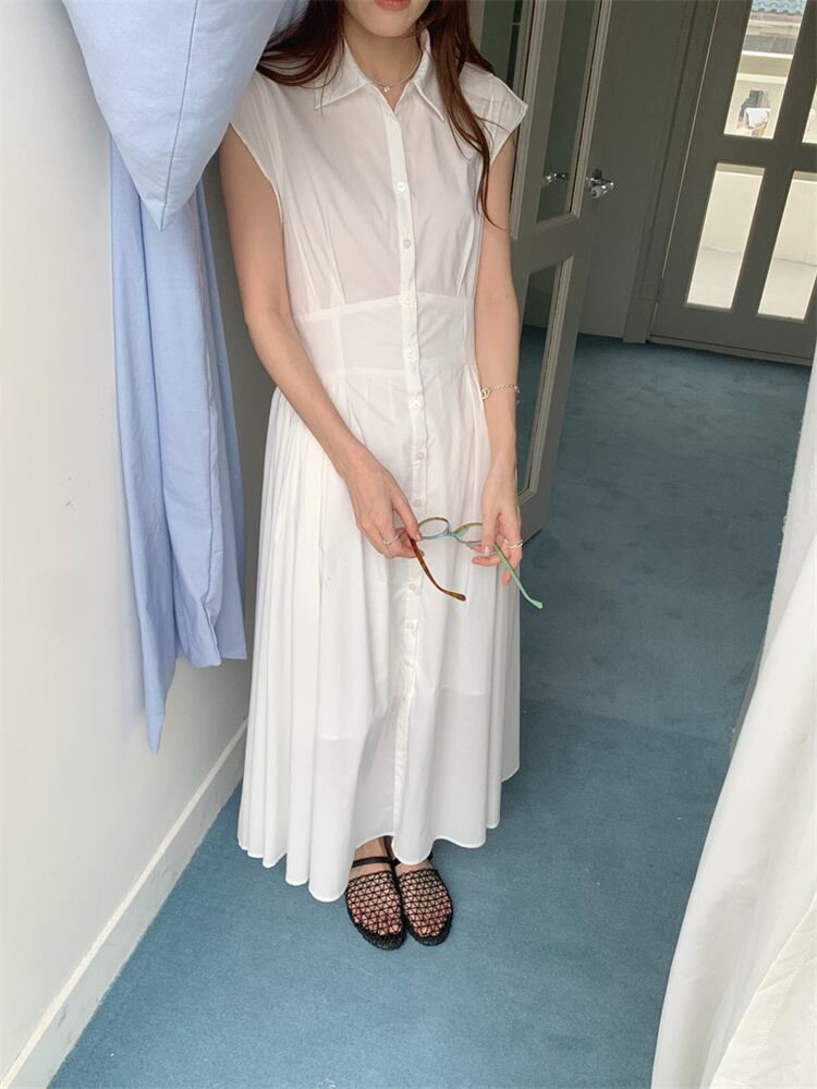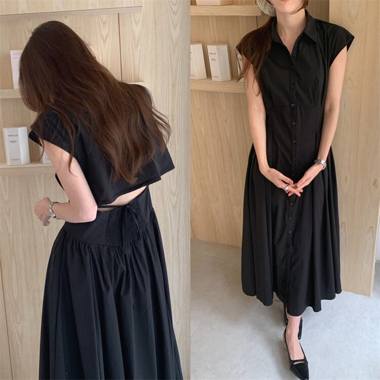 ノーバック リネンカラー シャツドレス フィットデザイン ロング丈 半袖 2色展開