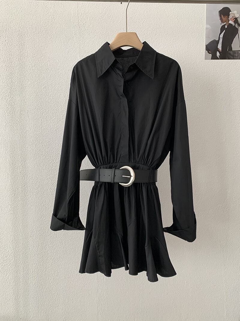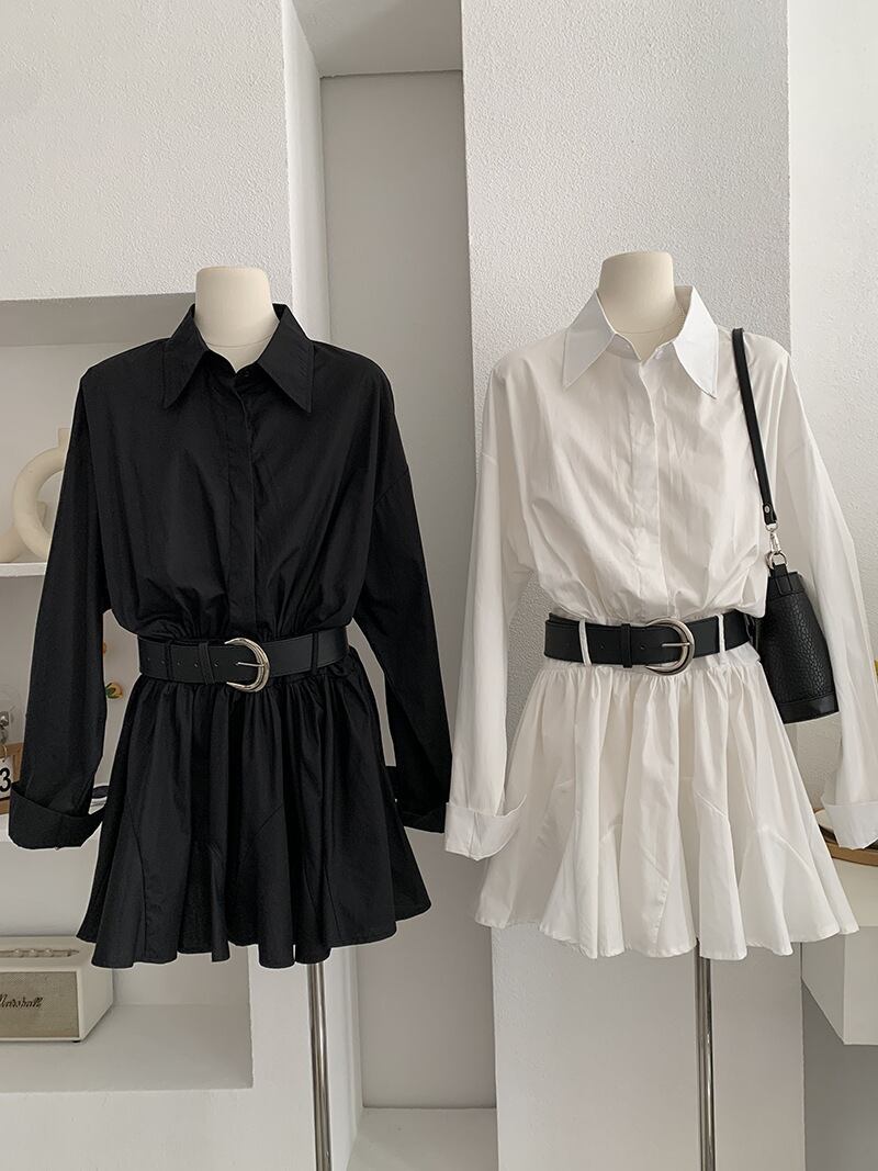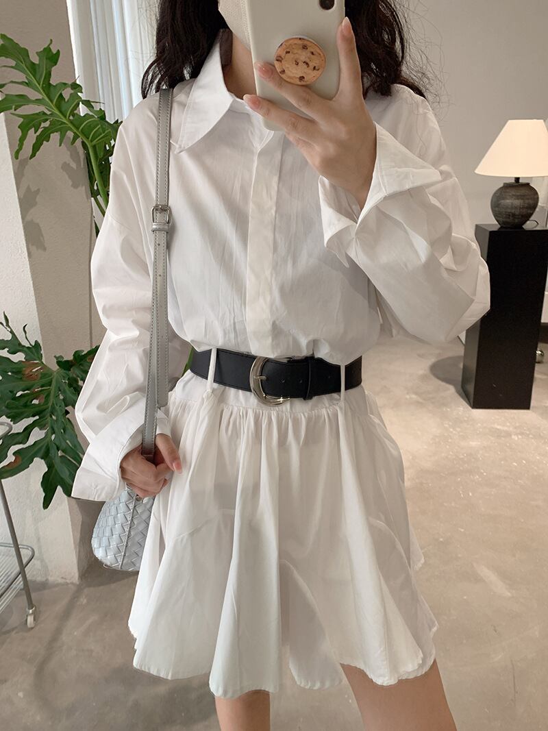 レディース ハイウエスト 長袖 無地 シャツ ミニ ワンピース ドレス 台型スカート