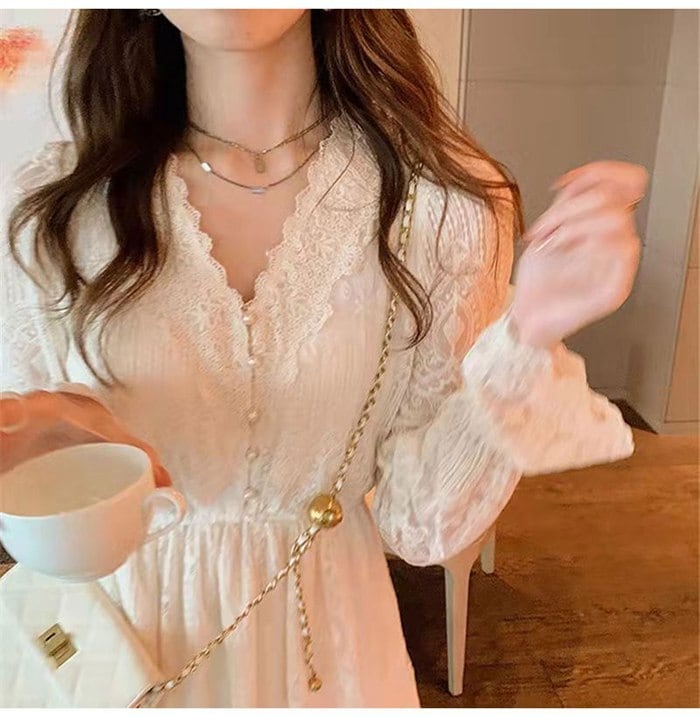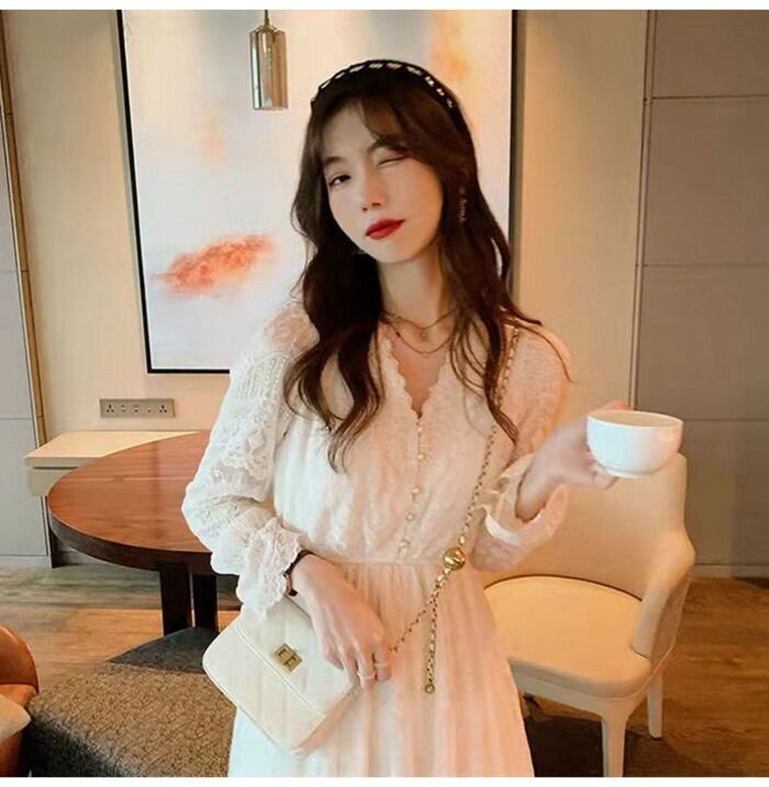 ワンピース レースワンピース ロング丈 レディース Vネット 体型カバー 長袖 シンプル カジュアル