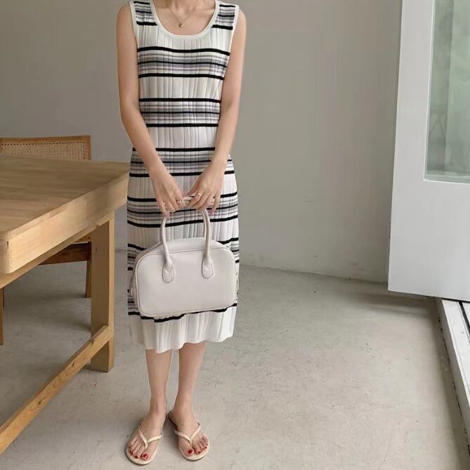 レディース ニットワンピ ノースリーブ タンクワンピ インナー ロング丈 マルチボーダー おしゃれ