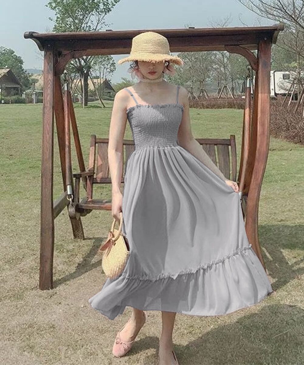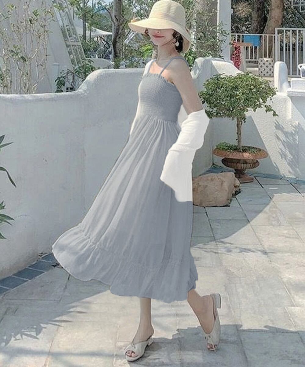 ビーチワンピース夏 ミモレ丈ワンピース フリルワンピ着やせ