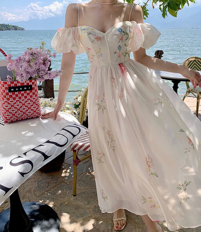 花柄ワンピース オフショルダー パフスリーブ キャミソールワンピース フレアワンピース ロングワンピ