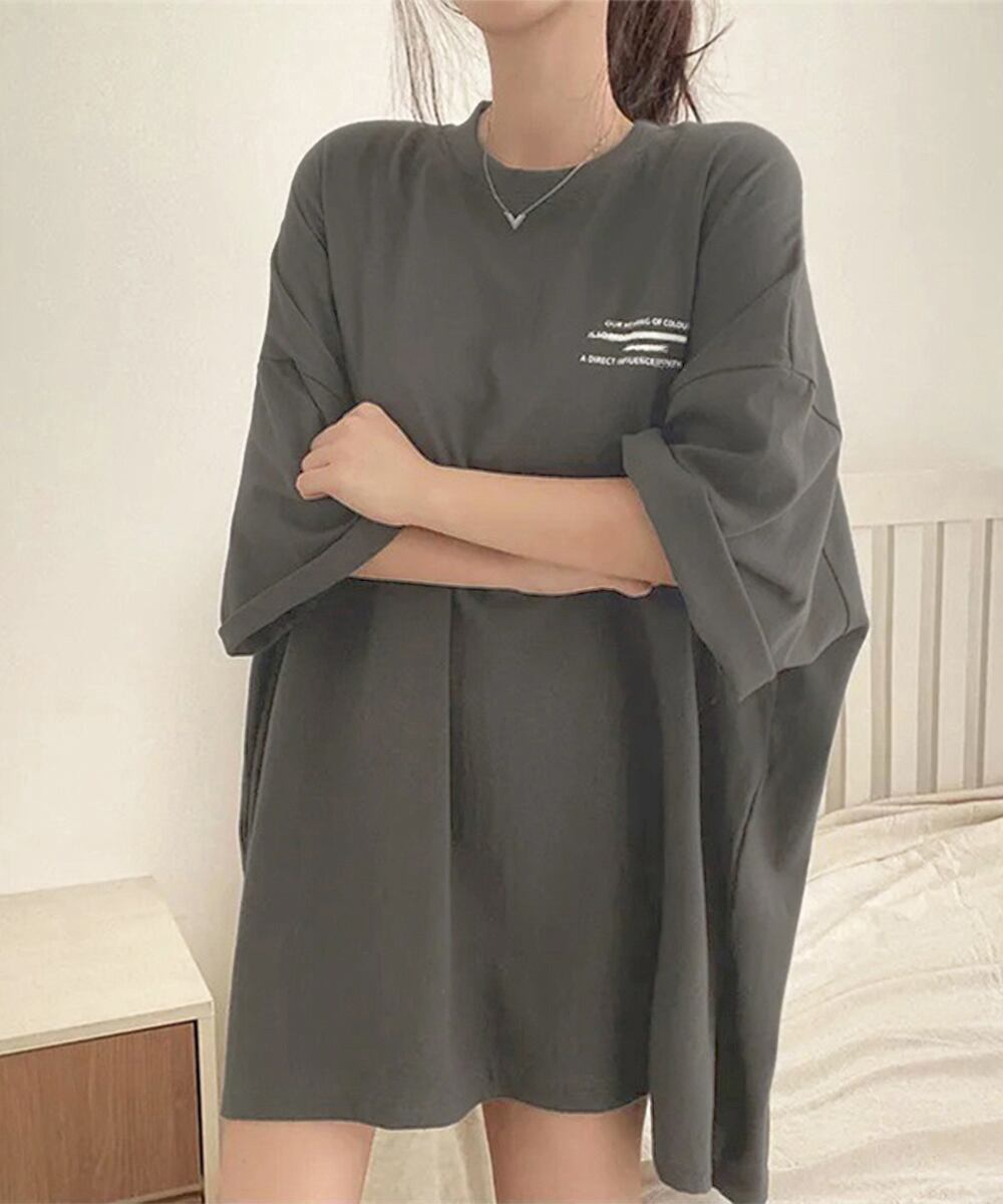 英字プリントtシャツ 体型カバー ドロップショルダー おしゃれ 着やせトップスカジュアル チュニックtシャツ 半袖韓国風